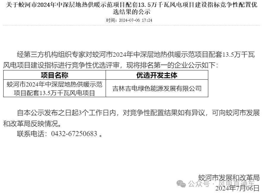 近日,蛟河市人民政府发布《关于蛟河市2024年中深层地热供暖示范项目配套13.5万千瓦风电项目建设指标竞争性配置优选结果的公示》,吉电股份东北区域公司全资子公司——吉林吉电绿色能源发展有限公司中选13.5万千瓦风电项目建设指标,为新时代东北振兴再添“吉电”绿能。