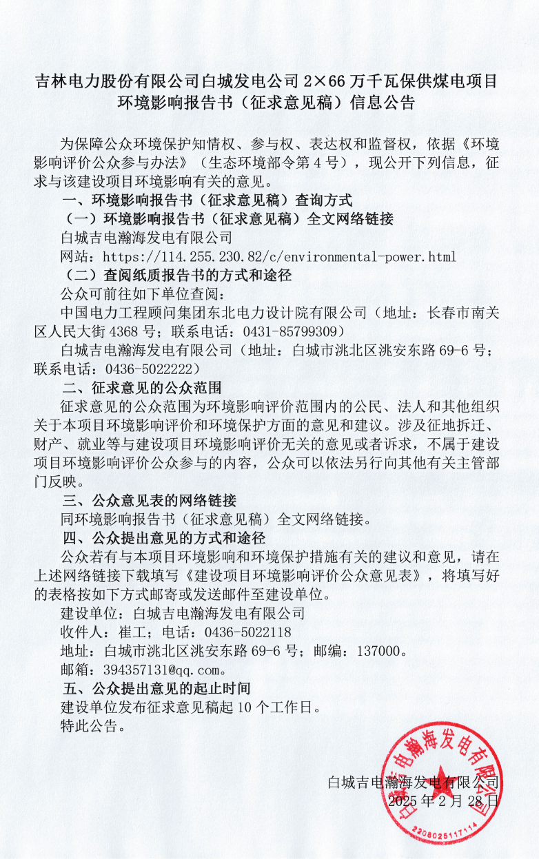 吉林电力股份有限公司白城发电公司2×66万千瓦保供煤电项目第二次公示(图)