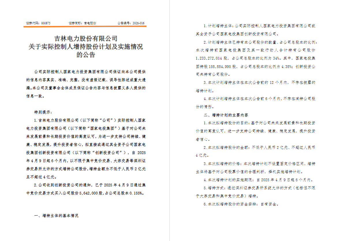 公告显示,国家电力投资集团有限公司(以下简称“国家电投集团”)作为吉林电力股份有限公司(股票代码:000875)的实际控制人,基于对中国能源产业高质量发展及公司长期投资价值的坚定信心,积极践行央企责任担当,持续赋能控股上市公司在绿色低碳转型中把握战略机遇,推动可持续发展,为全体股东创造更高价值的回报。为切实维护投资者利益,国家电投集团计划自2025年4月9日起6个月内,以不限于集中竞价交易、大宗交易等深圳证券交易所允许的方式增持公司股份,增持金额不低于人民币2亿元且不超过4亿元,进一步巩固市场信心,彰显对公司未来前景的高度认可,助力提升公司中长期价值。目前,增持计划已启动实施。4月9日,创新投资公司通过集中竞价交易方式首次购入公司股份5,642,000股,占公司总股本的0.155%,成交均价为5.138元/股。