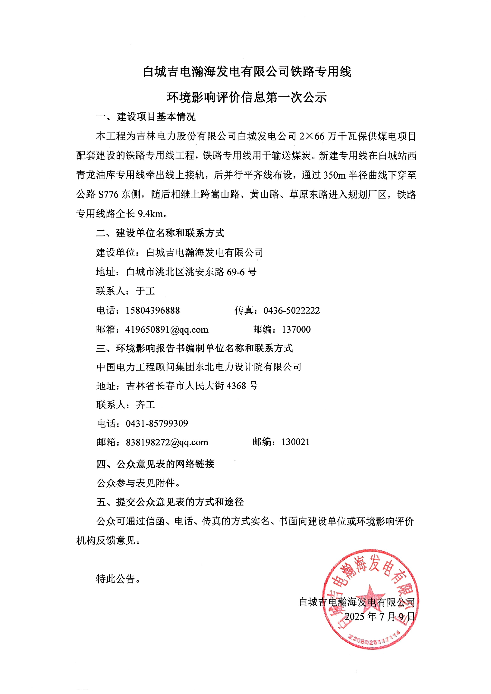 白城吉电瀚海发电有限公司铁路专用线环境影响评价信息第一次公示