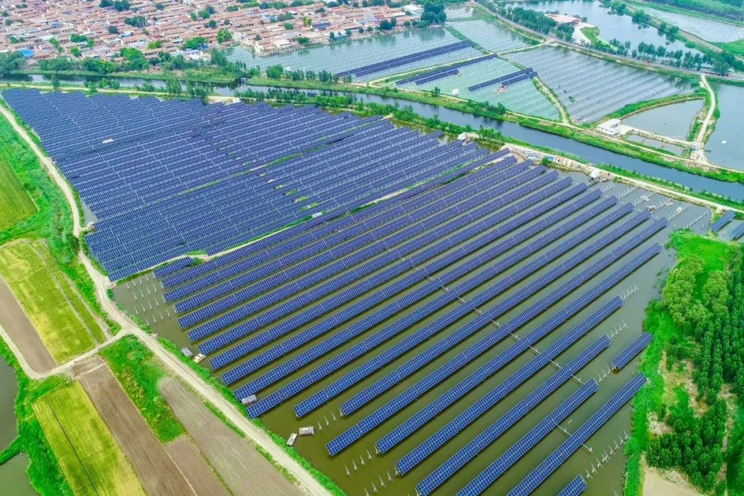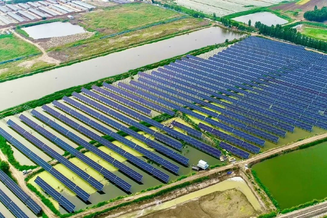项目位于第一批中国特色小镇——天津市武清区崔黄口镇,近年来,该镇依托自身和周边乡镇渔业养殖基地优势,不断建设现代化渔业综合开发项目。如何推动当地养殖渔业向“光伏发电+渔业”的“绿色+”产业方向发展,吉电股份探索实施了鱼塘上面发绿电、光伏板下鱼儿欢的“双丰收”发展模式,即在周边区域14个鱼塘上架设光伏板阵列,下方水域进行渔业养殖,在有效提高原有鱼塘资源利用率、为喜阴鱼类营造舒适生长环境的同时,增加了当地村民收入,反哺农村渔业经济发展,实现“一地两用、一举两得”。
