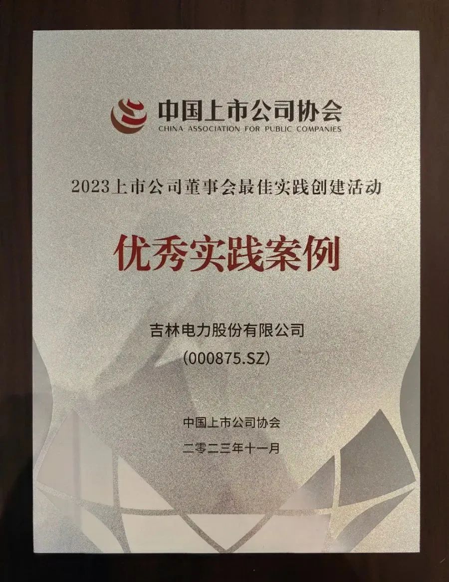 近日,在中国上市公司协会(简称“中上协”)主办,深圳市人民政府指导,深圳证券交易所支持,深圳市地方金融监管局、深圳市福田区人民政府承办的2023中国上市公司企业家年会暨2023上市公司董事会最佳实践案例发布活动中,吉电股份荣获“优秀实践案例”奖。
