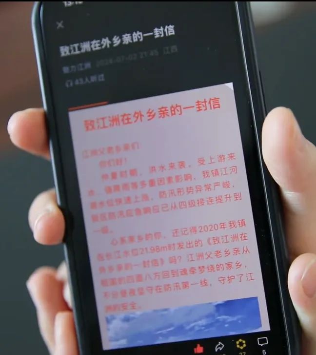 “乡亲们,当您看到这封信时,家乡再次需要您。”一封告急家书成为在外工作生活的江洲儿女齐刷刷的行动。