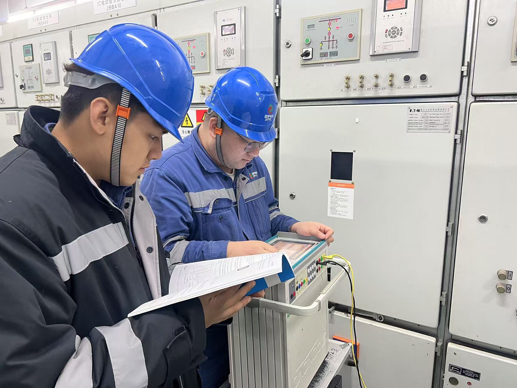 镜头转向电气二次班,他们正在进行10kV电源开关保护装置、二次回路及2号发变组保护检验。在《继电保护检验规程》的指引下,他们精心编制作业方案,全面分析检修记录,系统排查26面保护间隔屏柜、1800个接线端子,精准校核12项保护参数,保护装置动作准确率和回路绝缘合格率达到双100%,显著提升设备安全可靠性。