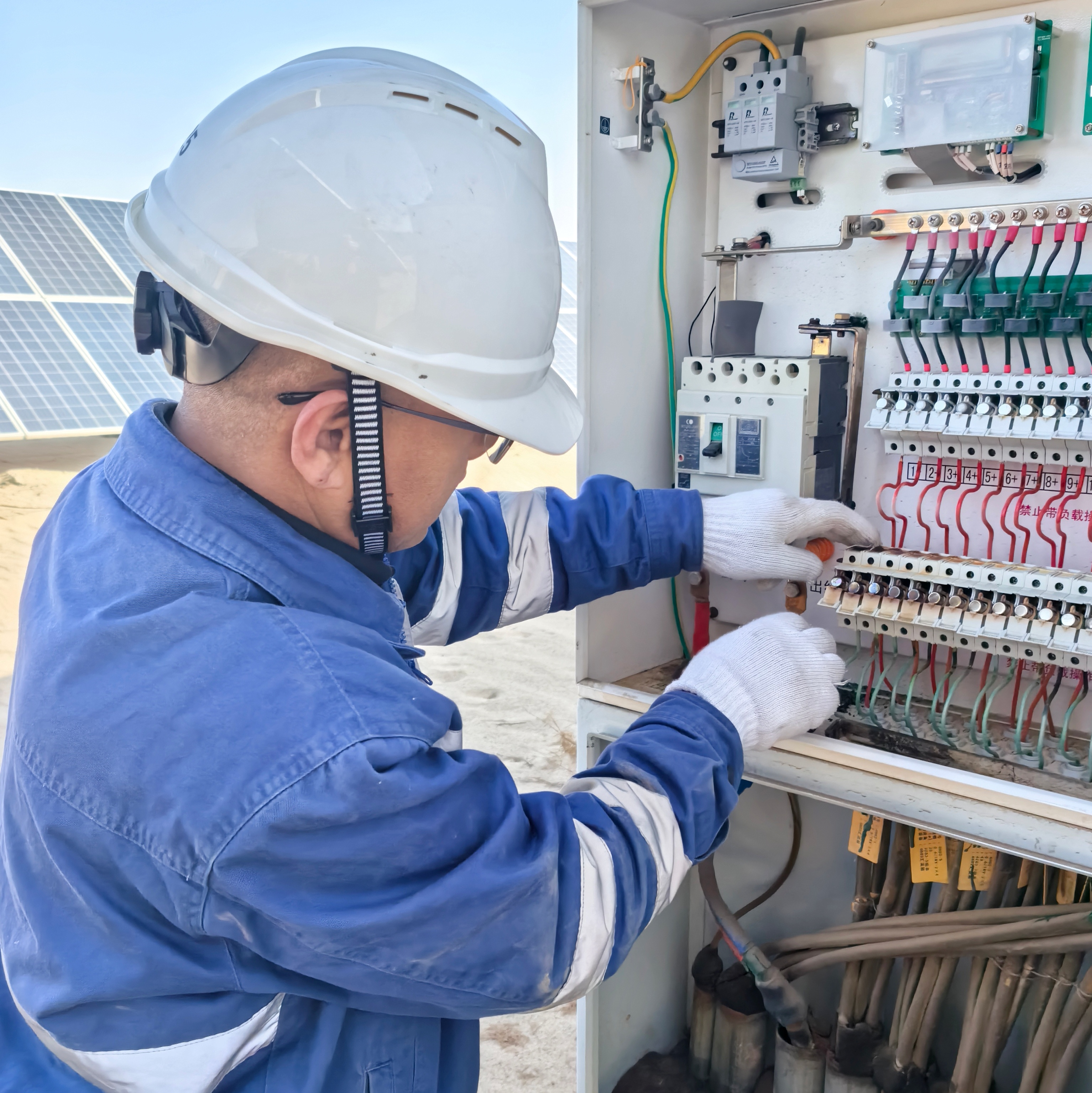 大风卷起沙尘,吹得人睁不开眼。“这些老化的电缆如果更换不及时,就可能发生短路引起火灾。”在西北区域公司新疆二道湖光伏电站发电阵列中,“一分钱”提质增效专项工作组副组长梁国义一边更换着汇流箱电缆,一边给运维人员讲解着电缆排查更换的注意事项。