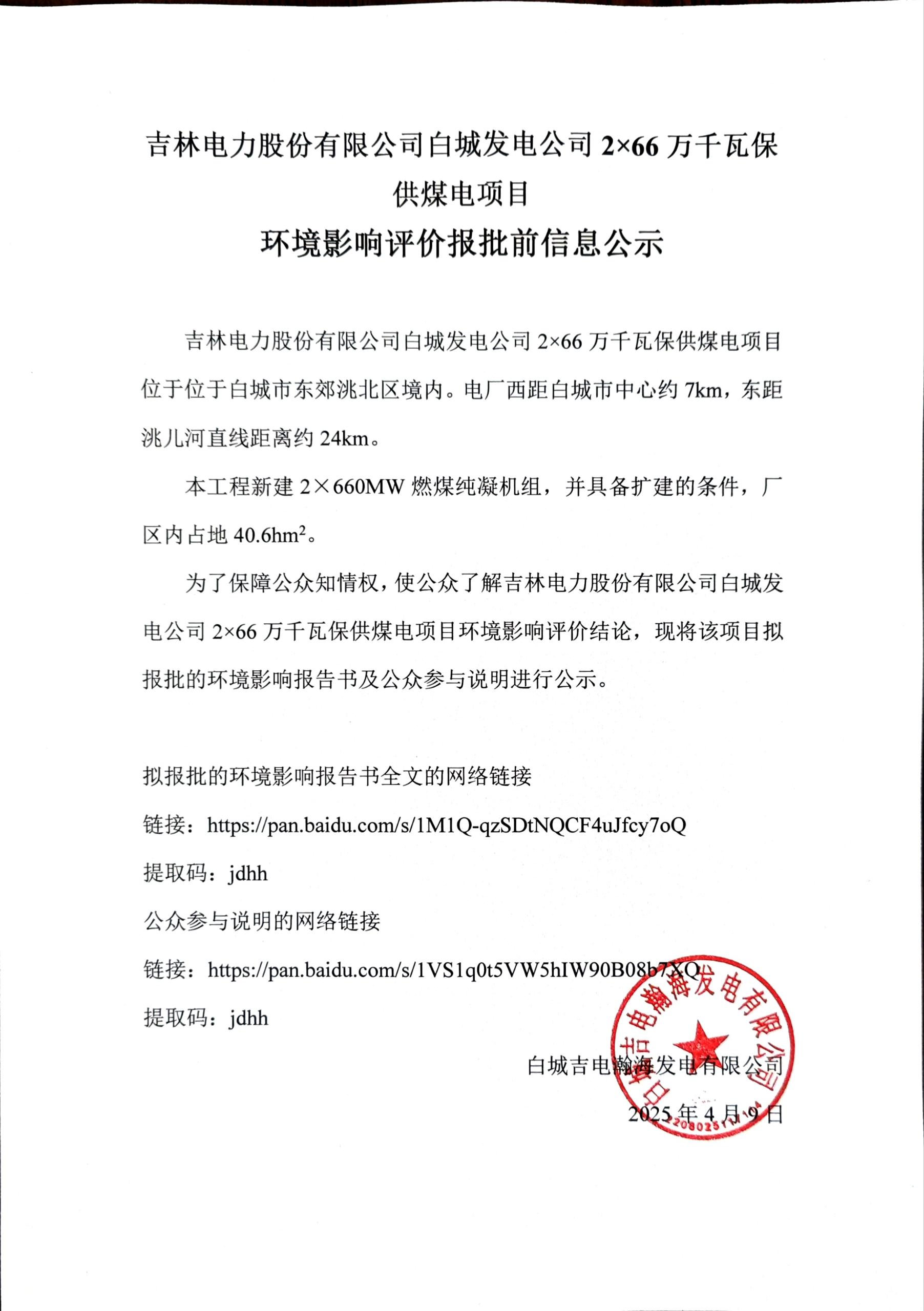 吉林电力股份有限公司白城发电公司2x66万千瓦保供煤电项目环境影响评价报批前信息公示(图)