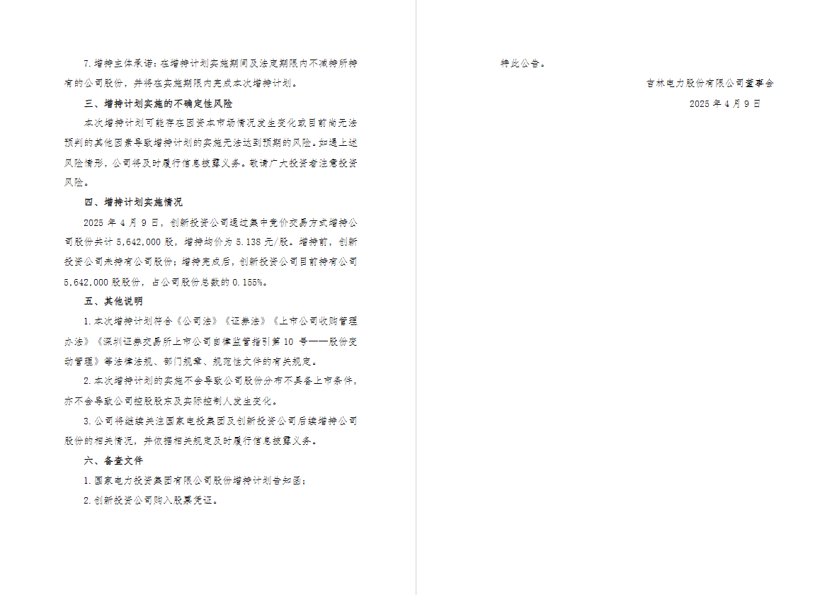 公告显示,国家电力投资集团有限公司(以下简称“国家电投集团”)作为吉林电力股份有限公司(股票代码:000875)的实际控制人,基于对中国能源产业高质量发展及公司长期投资价值的坚定信心,积极践行央企责任担当,持续赋能控股上市公司在绿色低碳转型中把握战略机遇,推动可持续发展,为全体股东创造更高价值的回报。为切实维护投资者利益,国家电投集团计划自2025年4月9日起6个月内,以不限于集中竞价交易、大宗交易等深圳证券交易所允许的方式增持公司股份,增持金额不低于人民币2亿元且不超过4亿元,进一步巩固市场信心,彰显对公司未来前景的高度认可,助力提升公司中长期价值。目前,增持计划已启动实施。4月9日,创新投资公司通过集中竞价交易方式首次购入公司股份5,642,000股,占公司总股本的0.155%,成交均价为5.138元/股。
