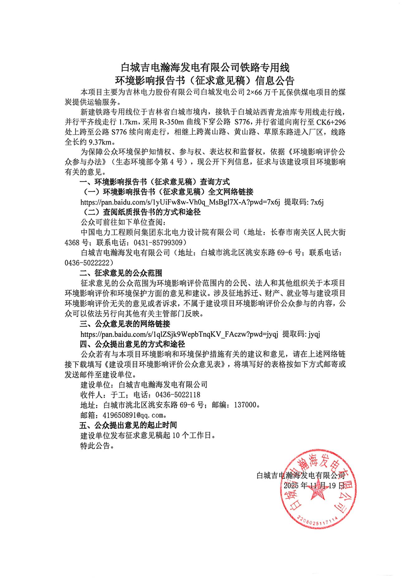 白城吉电瀚海发电有限公司铁路专用线环境影响报告书(征求意见稿)信息公告